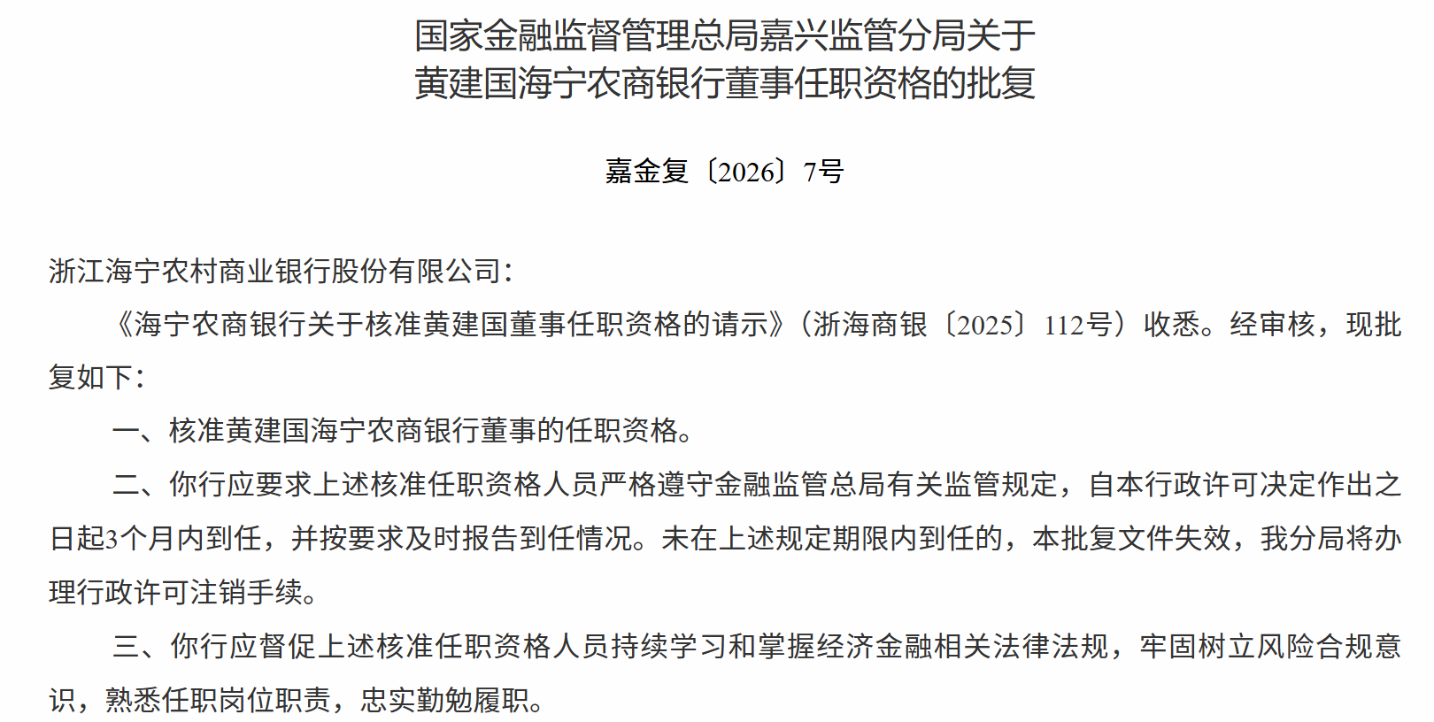 1月15日,国家金融监督管理总局嘉兴监管分局发布关于黄建国海宁农商银行董事任职资格的批复,核准黄建国海宁农商银行董事的任职资格。